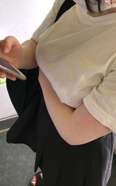 白いTシャツに黒のプリーツミニスカートというもうすでにスケベな着衣ですが、さらにTシャツが透けていてブラが見えまくってます